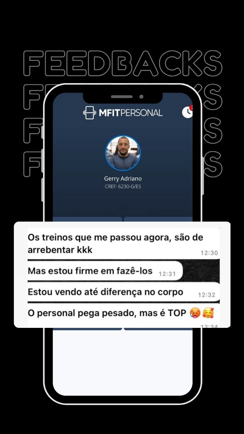 Você recebe seu treino dentro do aplicativo, com vídeos demonstrativos de cada exercício, espaço para feedback e atualizações mensais. Além disso, você tem meu acompanhamento semanal pelo WhatsApp e Instagram para ajustes rápidos e suporte constante.