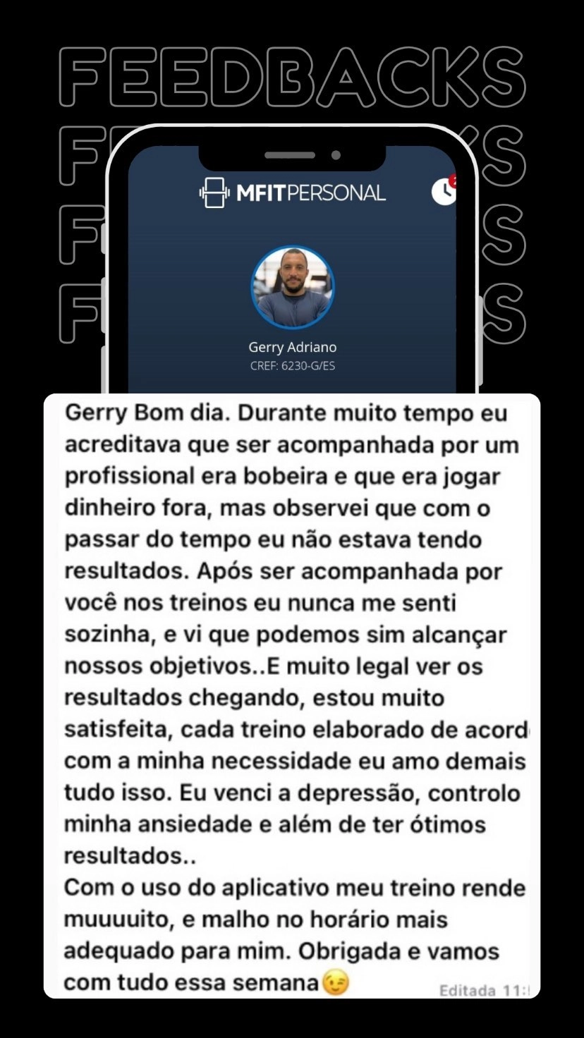 Com uma metodologia baseada em treinos personalizados e acompanhamento próximo, ofereço praticidade para quem tem a rotina corrida, além de segurança e confiança em cada etapa do processo. Atendo tanto de forma presencial em Vitória e Vila Velha, quanto por meio da minha consultoria online, onde entrego treinos exclusivos via aplicativo, atualizados mensalmente e com suporte direto pelo WhatsApp e Instagram.