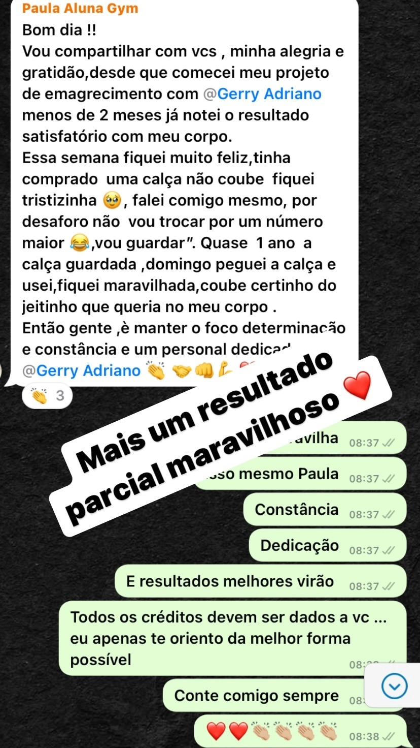 Você terá contato direto com o Personal pelo WhatsApp, de segunda a sábado, para tirar dúvidas, receber ajustes nos treinos e ter o acompanhamento de perto durante sua evolução.